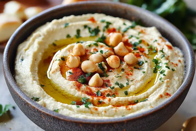 Step 10: Garnish the hummus with a sprinkle of paprika (or sumac/zhough for more exotic flavor profiles), toasted pine nuts for added texture and a nutty taste, and fresh herbs like chopped parsley or cilantro for freshness and visual appeal.