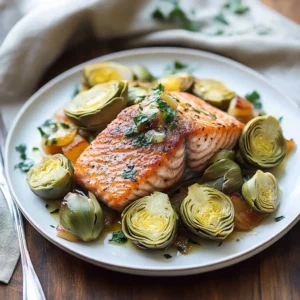 Description of this recipe: This recipe features perfectly cooked salmon with crispy skin, paired with tender baby artichokes roasted to …