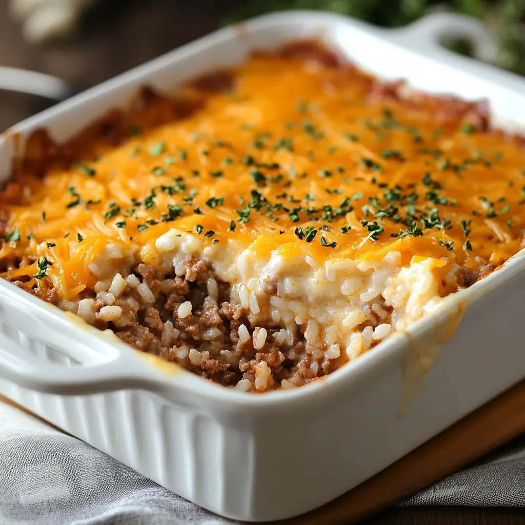 This casserole is not only delicious but also incredibly easy to prepare. With just a few simple ingredients, you can create a meal that feels indulgent but is also quite practical for everyday cooking. The combination of flavors from the seasoned beef, creamy sauce, and rich cheddar cheese creates a delightful balance that will have your family asking for seconds. Plus, it’s a great way to use up leftover rice, making it a budget-friendly option.
