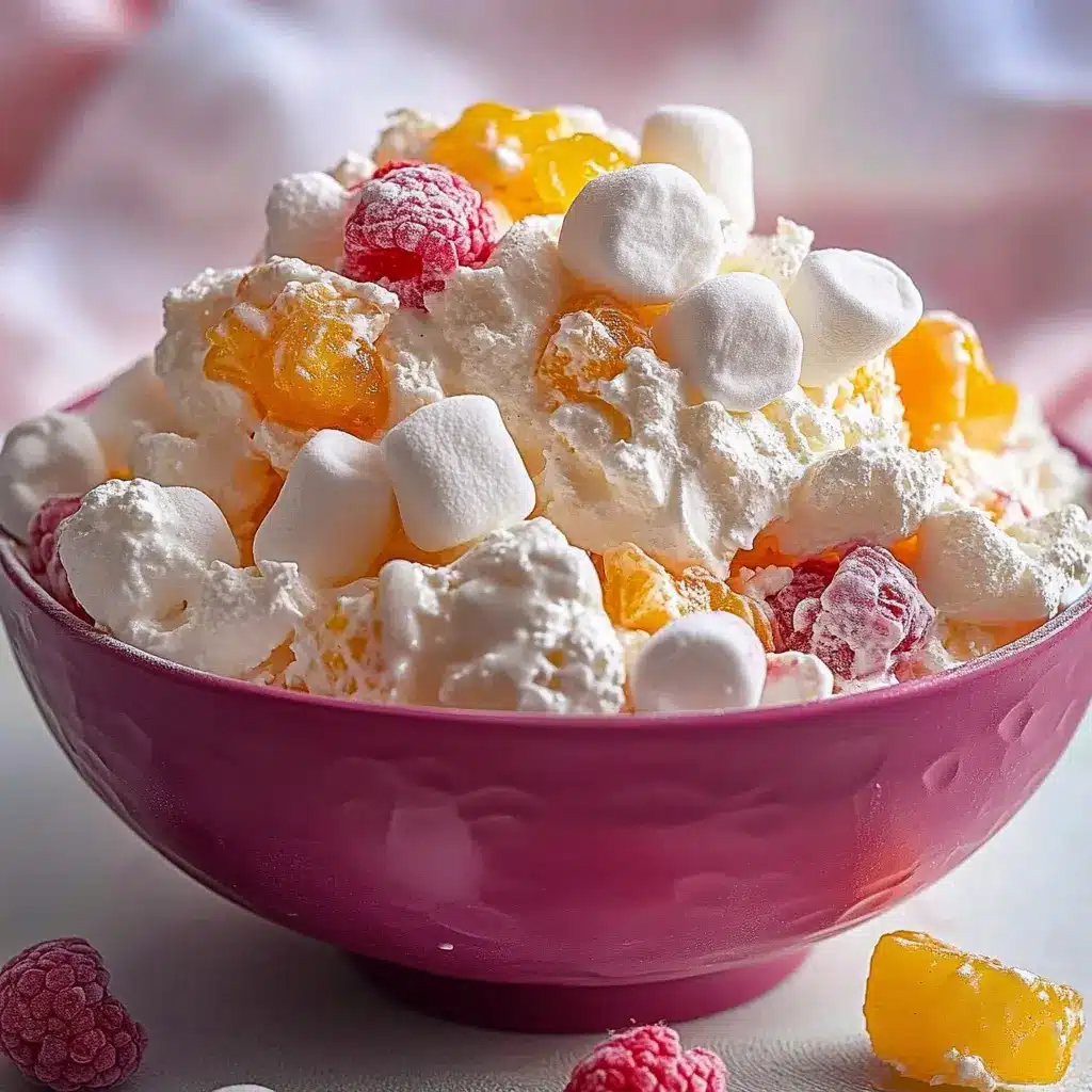 Step 2: Combine the Ingredients – In the large mixing bowl, combine the drained mandarin oranges, pineapple chunks, and maraschino cherries. Add the shredded sweetened coconut and mini marshmallows to the mixture. The coconut provides a delightful texture and tropical flavor, while the marshmallows add a touch of sweetness and chewiness that complements the fruits perfectly.