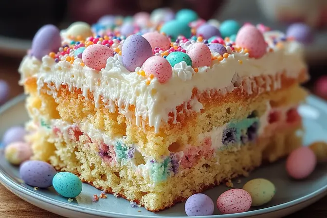 - Garnish: Top with Easter sprinkles, mini chocolate eggs, or your favorite festive decorations. Get creative with your decorations and personalize the cake to your liking. You can also use fresh berries, edible flowers, or even a drizzle of melted chocolate.