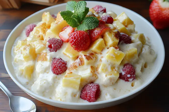 A: Absolutely! In fact, I highly recommend making it at least 4 hours in advance, or even better, overnight. This allows the flavors to meld together beautifully, and the fruit to fully absorb the cheesecake dressing. However, keep in mind that the fruit may release some juices as it sits, so it’s best to serve it within 24-48 hours for the best texture and appearance. Before serving, you can gently drain off any excess liquid that may have accumulated at the bottom of the bowl.