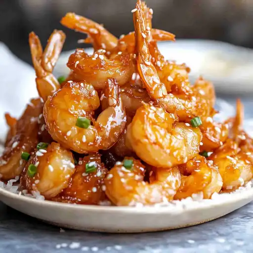 - Garnish and Serve: Pile the Honey Prawns over a bed of crispy rice noodles, if desired. Sprinkle with sesame seeds and finely sliced green onions for added flavor and visual appeal. Serve immediately and enjoy!