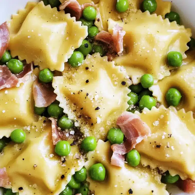 Why you will love this recipe: You will love this recipe because it transforms a simple store-bought item into a restaurant-worthy dish in under 30 minutes. The combination of salty, cheesy, and savory flavors is irresistible, and the addition of peas and prosciutto adds both texture and visual appeal. It’s a balanced and satisfying meal that’s easy to customize to your liking. The slight sweetness of the caramelized onions balances perfectly with the peppery bite of the Cacio e Pepe, while the crispy prosciutto adds a delightful crunch. Plus, the use of pasta water creates a silky, emulsified sauce that coats every ravioli perfectly. It’s a comforting yet sophisticated dish that will impress anyone you serve it to.